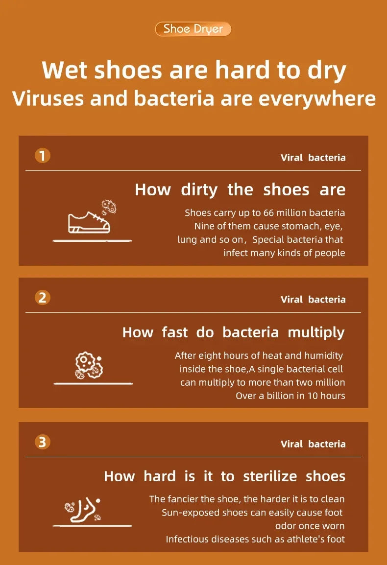 • Deodorization and Disinfection: This dryer can not only dry shoes, but also deodorize and disinfect them, making them smell fresh and clean.